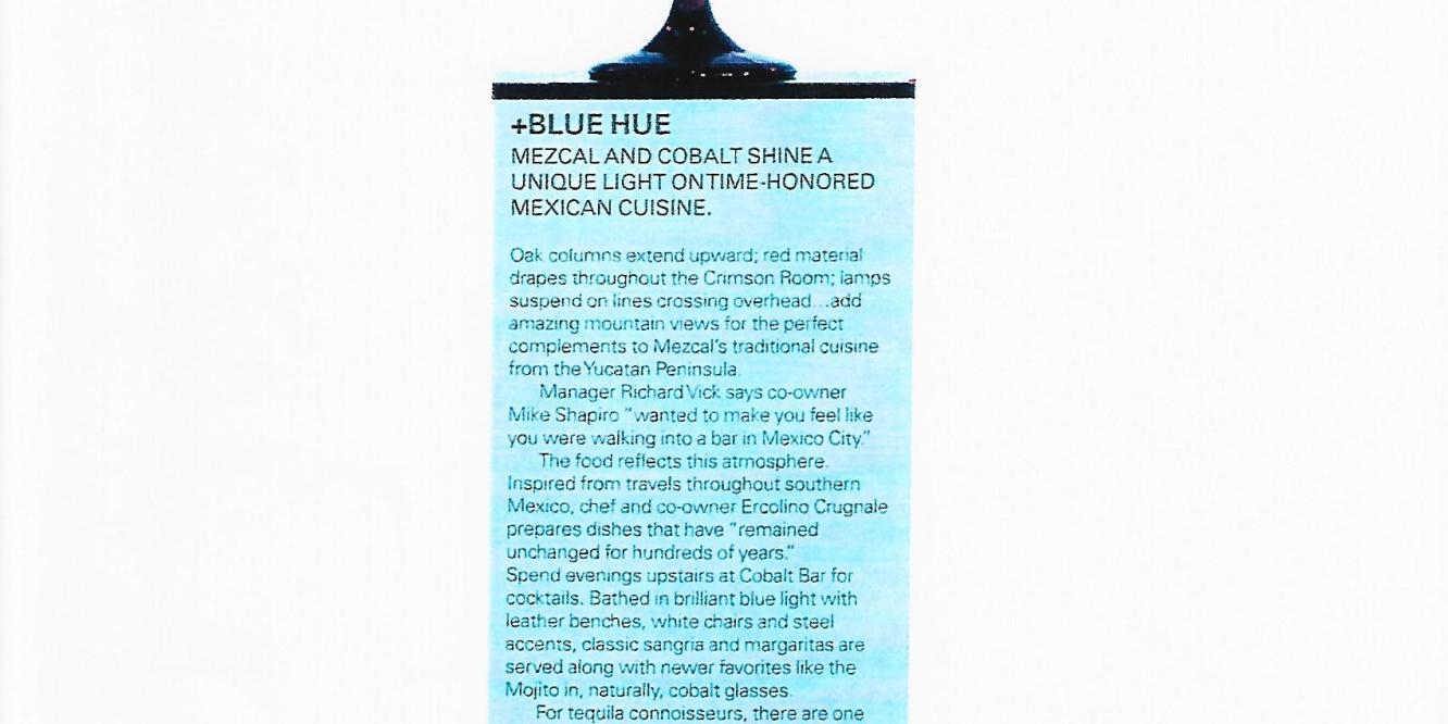 An article for the now-defunct Item Magazine, this piece briefly profiles Metro Phoenix area restaurant Mezcal and the Cobalt Bar located upstairs.