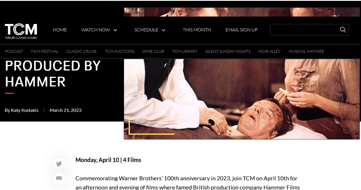 For Turner Classic Movies in March 2023, as Warner Brothers celebrates its centennial anniversary in April 2023, I discuss the collaboration between the studio and British production outfit Hammer Films, focusing on “Hammer Horror” and stars Christopher Lee and Peter Cushing.