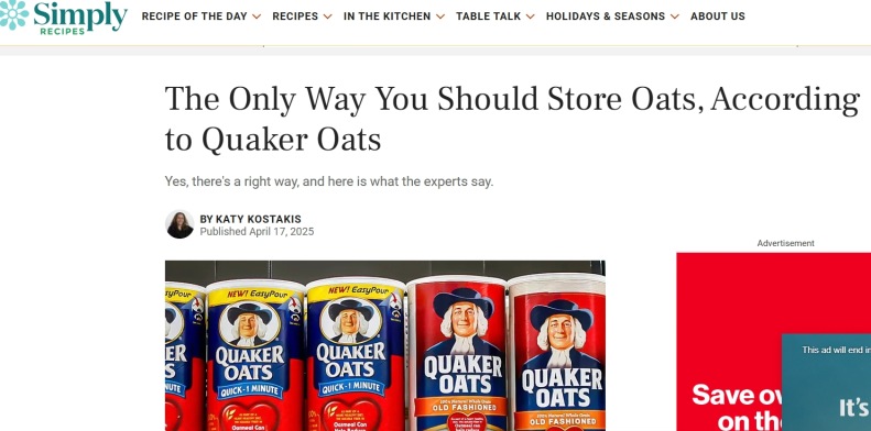 For Simply Recipes, I delve into the proper storage methods of oats, incorporating advice given by Quaker Oats, a leading grain brand in the United States.