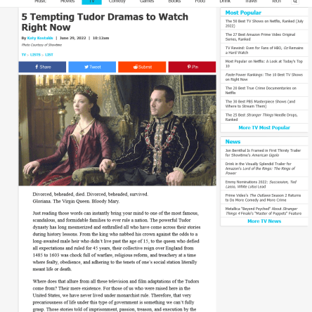 For Paste Magazine, this article published on June 29, 2022 lists my picks for several of the most entertaining film and television dramas portraying the Tudors. https://www.pastemagazine.com/tv/list/best-tudor-films-tv-shows/