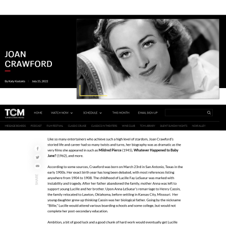 Coinciding with Turner Classic Movies‘ August programming for its Summer Under the Stars series, this article published in July 2022 profiles actress Joan Crawford’s life and career. https://www.tcm.com/articles/Programming%20Article/021640/joan-crawford