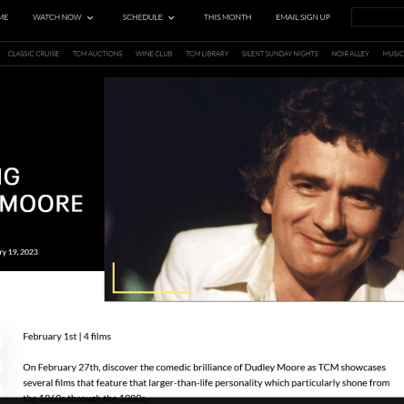 For Turner Classic Movies, this article published in January 2023 centers on actor Dudley Moore and the films programmed on February 1, 2023. https://www.tcm.com/articles/Programming-Article/021729/starring-dudley-moore